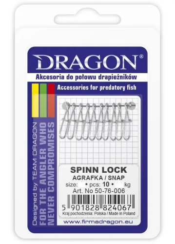 Agrafka z krętlikiem Dragon Spinn Lock r. 2 o wytrzymałości 29 kg to solidny element zestawu spinningowego przeznaczony do połowu większych drapieżników. Połączenie wytrzymałej agrafki typu Spinn Lock z krętlikiem skutecznie zapobiega skręcaniu żyłki oraz umożliwia szybką wymianę przynęt.
