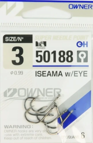 Haczyki Owner ISEAMA 50188 w rozmiarze 3 to mocne, kute haczyki z oczkiem, przeznaczone do łowienia metodą gruntową, feederową oraz spławikową. Charakteryzują się solidną konstrukcją oraz bardzo ostrym grotem, co zapewnia skuteczne zacięcie i pewne trzymanie ryby.
