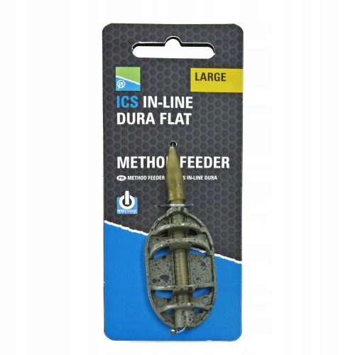 Innowacyjne koszyki z systemem ICS (Inter Change System) umożliwiającym wymianę wielkości lub gramatury koszyka bez konieczności demontażu całego zestawu. Koszyki In-Line Dura Flat Method Feeder występują w dwóch wielkościach small i large w wersji przelotowej (In-Line). Specyficznie rozmieszczone żebra koszyka minimalizują ryzyko splątania przynęty z haczykiem. Dzięki niebywałej wytrzymałości i systemowi ICS ten model w krótkim czasie stał się najczęściej wybieranym koszykiem do metody wśród wędkarzy.