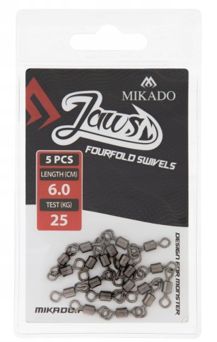 Wytrzymały krętlik Mikado Jaws Fourfold Swivels o wytrzymałości 25 kg to solidny element zestawu spinningowego przeznaczony do łowienia drapieżników. Konstrukcja czterokrotnego łożyskowania minimalizuje skręcanie linki oraz poprawia pracę przynęty w wodzie.