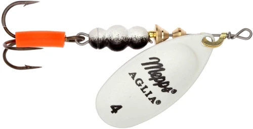 Klasyczna błystka obrotowa Mepps Aglia Fluo biała nr 4 to większa i mocniejsza przynęta spinningowa przeznaczona do połowu większych drapieżników. Fluorescencyjna, biała paletka aktywowana światłem UV pozostaje dobrze widoczna nawet na dużej głębokości oraz w mętnej wodzie, gdzie standardowe kolory tracą skuteczność