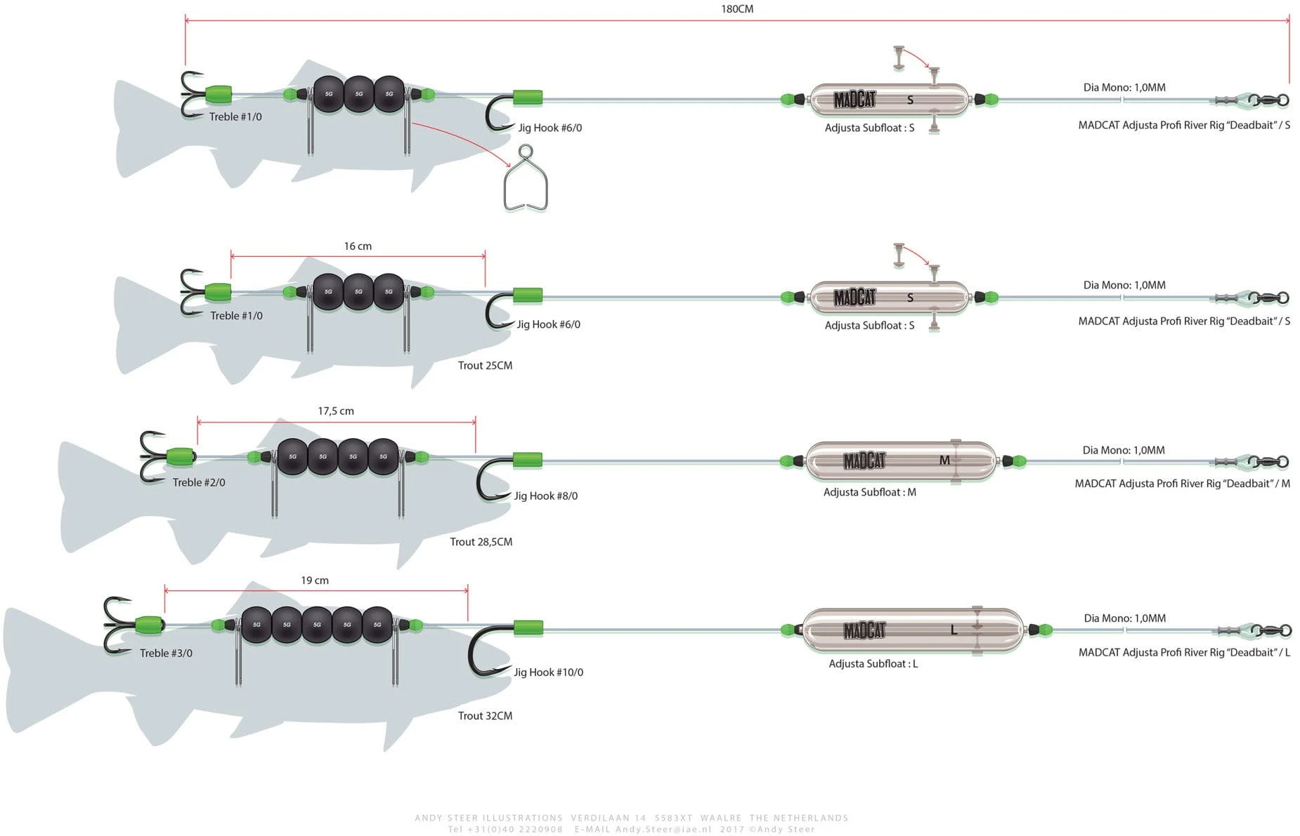 Zestaw z „cichym” podwodnym splawikiem MADCAT Ajusta Subfloat do łowienia gruntowego w rzekach o szybkim uciągu za pomocą martwej rybki. Zbudowane na lince MADCAT Ultra Soft Mono Leader 1.0mm. Dostępne w rozmiarach: 20, 40 i 60 gram (do wielkości przynęt: 25, 28,5 i 32 cm).