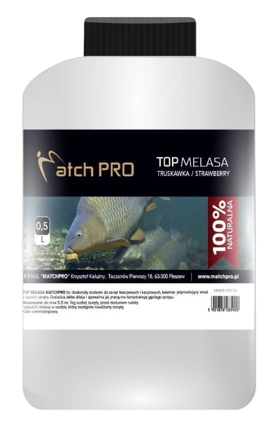 Melasa MatchPro TOP Truskawka o pojemności 500 ml (ok. 500 g) to wysokiej jakości płynny dodatek do zanęt wędkarskich. Intensywny słodki aromat truskawki skutecznie przyciąga ryby i zwiększa atrakcyjność mieszanki zanętowej, szczególnie podczas połowu ryb karpiowatych.