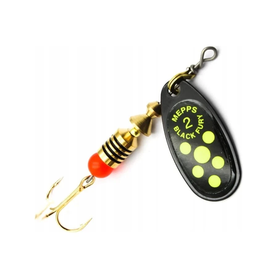 Obrotówka Mepps Black Fury w czarnym wykończeniu z seledynowymi kropkami przeznaczona do lekkiego spinningu w rzekach i mniejszych zbiornikach. Ciemne skrzydełko ogranicza nadmiar refleksów świetlnych, a fluorescencyjne punkty stanowią wyraźny cel ataku, skutecznie prowokując ryby nawet przy słabszej aktywności.