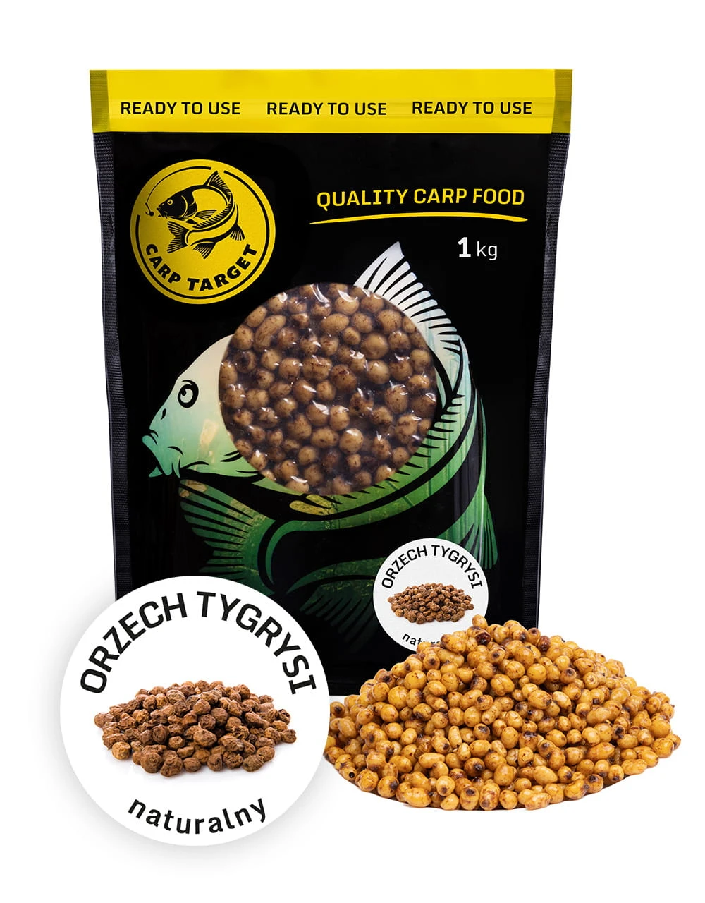 Orzech tygrysi jest jadalną bulwą roślinną w postaci małych, pomarszczonych kulek, z „tygrysimi” paskami, od których pochodzi jego nazwa. Swoją skuteczność orzechy tygrysie zawdzięczają dobremu smakowi i zapachowi oraz wartościom odżywczym. W Carp Target oferujemy profesjonalnie przygotowane ziarna orzecha tygrysiego, gotowe do użytku bezpośrednio z opakowania. Są one świetnym rozwiązaniem szczególnie w momencie, kiedy nie masz czasu na samodzielne przygotowanie ziarna lub chcesz mieć pewność, że będą one odpowiednio przygotowane. Czym charakteryzują się nasze ziarna orzecha tygrysiego na karpia?
