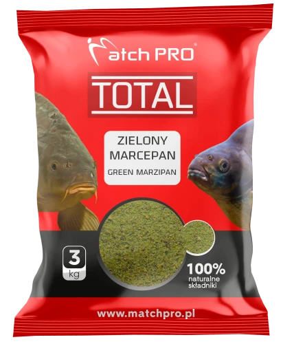 Zanęta MatchPro Total Zielony Marcepan 3 kg to uniwersalna mieszanka przeznaczona do połowu ryb karpiowatych, oparta na intensywnym, słodkim aromacie marcepanu.
