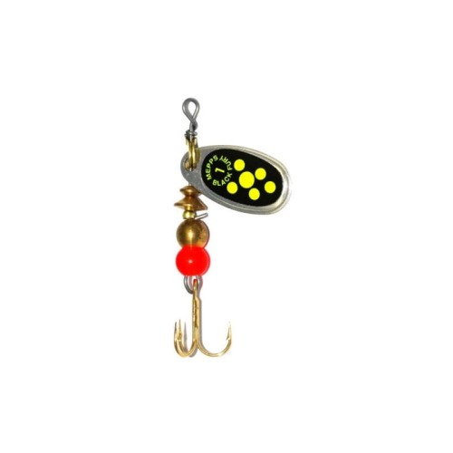 Mepps Black Fury #1 (3,5 g) w wersji srebrnej z żółtymi kropkami to jedna z najbardziej uniwersalnych błystek obrotowych stosowanych w spinningu. Połączenie błyszczącej paletki i kontrastowych punktów sprawia, że przynęta jest bardzo dobrze widoczna w wodzie i skutecznie prowokuje ryby do ataku.