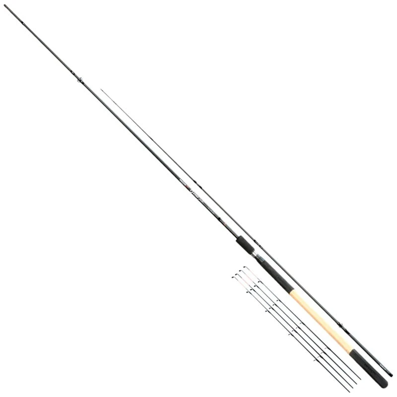 Model wyposażono w cztery węglowe szczytówki o różnej czułości, które pozwalają dopasować wędkę do warunków łowiska oraz intensywności brań. Profilowany dolnik oraz ergonomiczna rękojeść z korka i pianki EVA zapewniają pewny chwyt i komfort użytkowania nawet podczas długiego łowienia.
