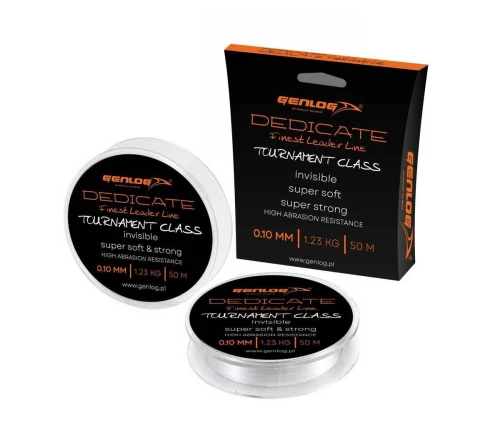 Genlog Dedicate Leader 0.10 mm to wysokiej jakości żyłka przyponowa przeznaczona do wiązania przyponów feederowych oraz spławikowych. Charakteryzuje się dużą wytrzymałością na węźle, wysoką odpornością na przetarcia oraz bardzo dobrą elastycznością.